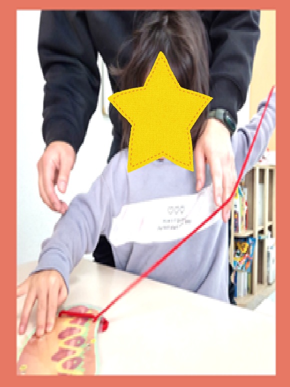 今月の個別課題では、信頼関係を築きながら、椅子に座って、前にいる先生の指示を聞く姿勢を作ることなどを目的として、基礎課題を中心に行っています。負担にならないように楽しく学べるように工夫して行っています。